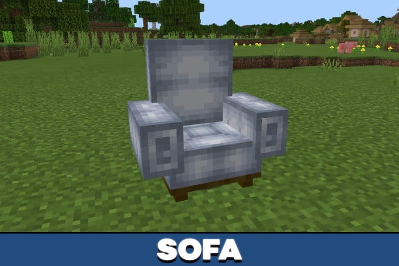 In this kitchen mod for Minecraft PE, the user can find many different and useful furniture. First of all, there are four types of tables in the modification. A lot of different other furniture can be placed on them. Also, this mod adds a sofa to the game.